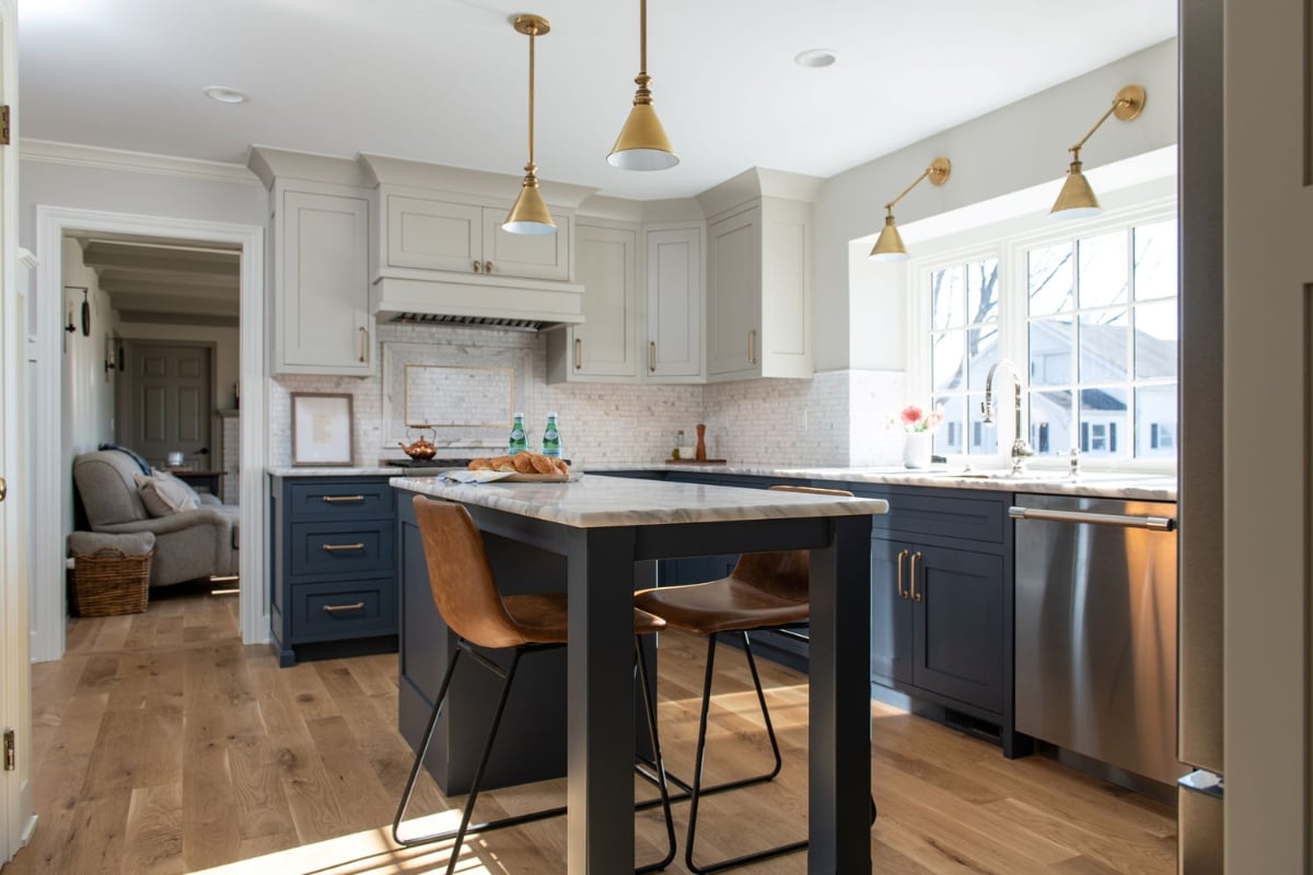 Image Above: Kitchen remodel in Barrington, IL, featuring cream and navy cabinets and marble countertops.
