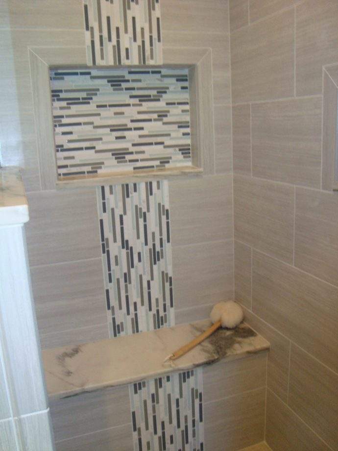 We added visual interest to the bathroom by having the tile go halfway up the walls and by keeping the tile consistent through the floor, backsplash, shower, and walls around the tub. To improve storage, we added two niches to the shower area and a vanity and linen cabinet (made by Custom Wood Products, our custom cabinet supplier).